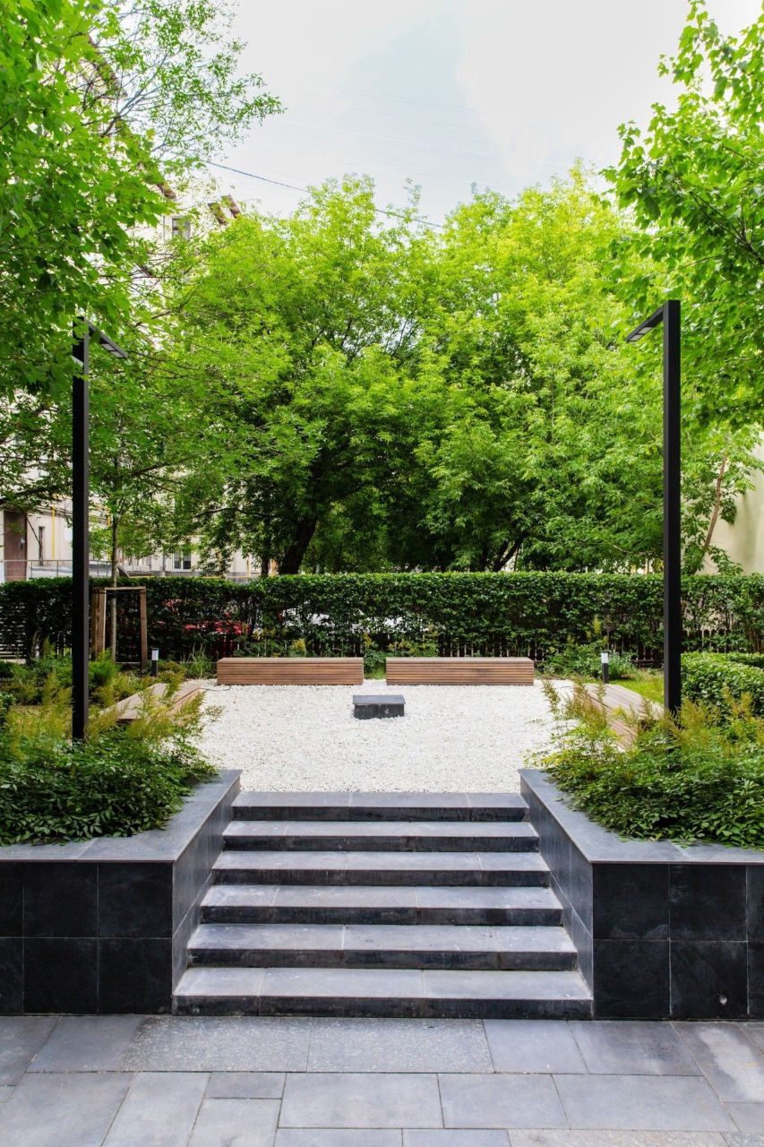 Восточный сад в атриуме внутри дома оформлен в минималистичном стиле и поддерживает умиротворенную атмосферу резиденции. Природный камень, цветущие сакуры и естественный свет создают медитативное пространство, что позволяет переключаться с насыщенного ритма центра Москвы на свой собственный.
